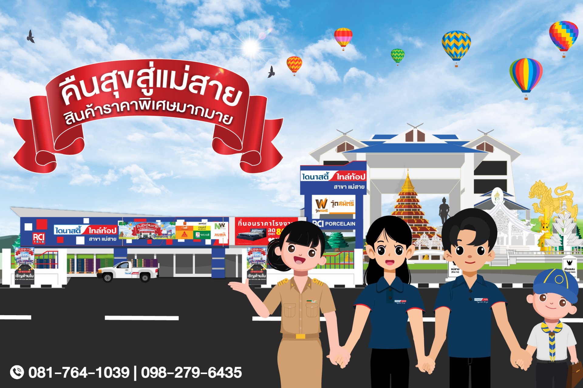 ไดนาสตี้ ไทล์ท้อปพร้อมทัพพันธมิตร จัดกิจกรรม คืนสุขสู่แม่สาย เติมความสุข สร้างปรับปรุงให้บ้านใหม่ จัดลดราคากระเบื้องพิเศษ พร้อมอุปกรณ์ปูกระเบื้อง และอุปกรณ์ตกแต่งมากมาย เพื่อพี่น้องชาวแม่สาย และบริเวณพื้นที่ใกล้เคียง
