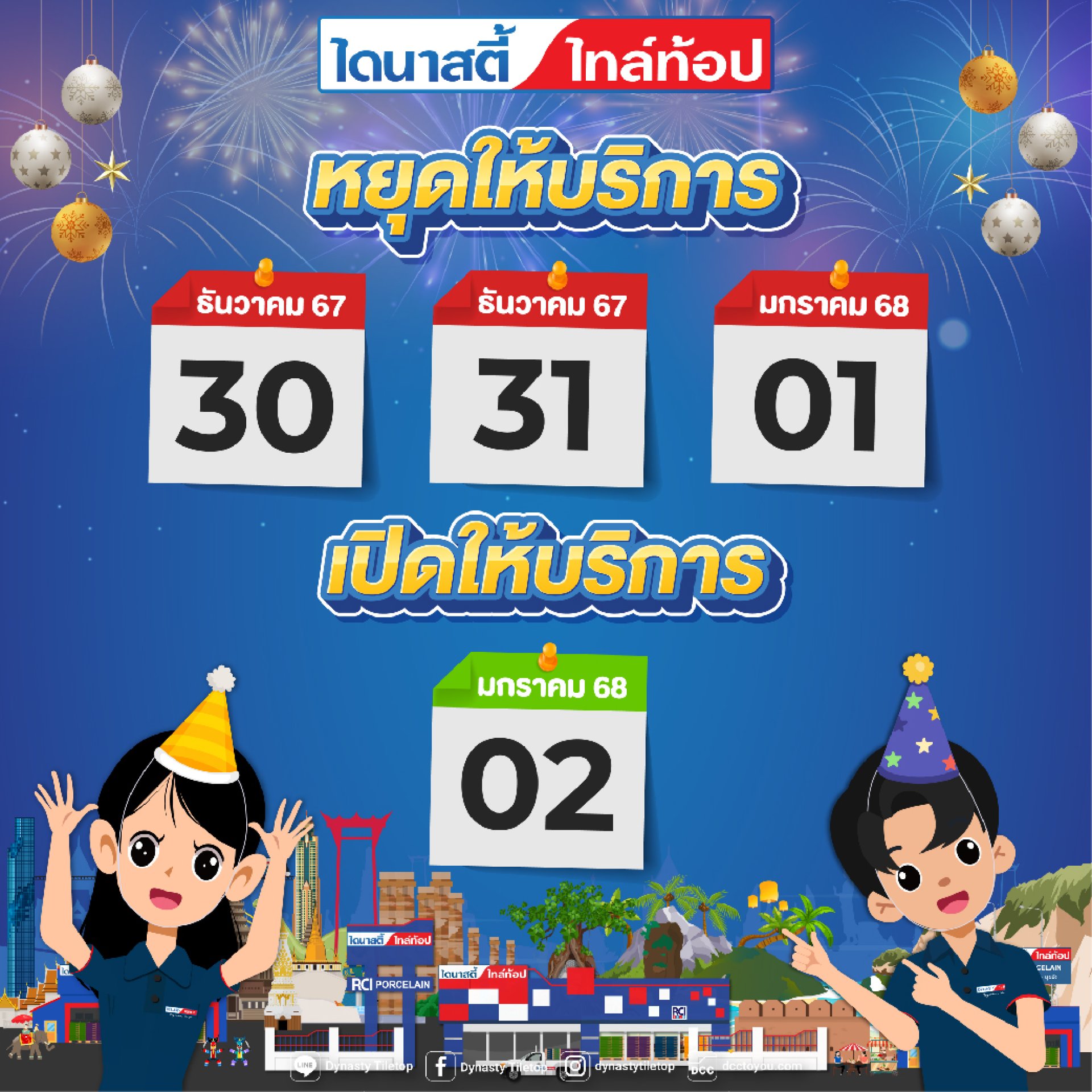 ประกาศ ประกาศ ลูกค้าไดนาสตี้ ไทล์ท้อปทุกท่าน ไดนาสตี้ ไทล์ท้อปทุกสาขา ทั่วไทย เปิดให้บริการถึงวันที่ 29 ธ.ค.67 เป็นวันสุดท้าย ก่อนหยุดให้บริการในช่วงเทศกาลวันปีใหม่ ตั้งแต่วันที่ 30 ธ.ค. 67-1 ม.ค. 68 โดยจะเปิดให้บริการอีกทีในวันที่ 2 ม.ค. 68 เป็นต้นไปค่ะ
