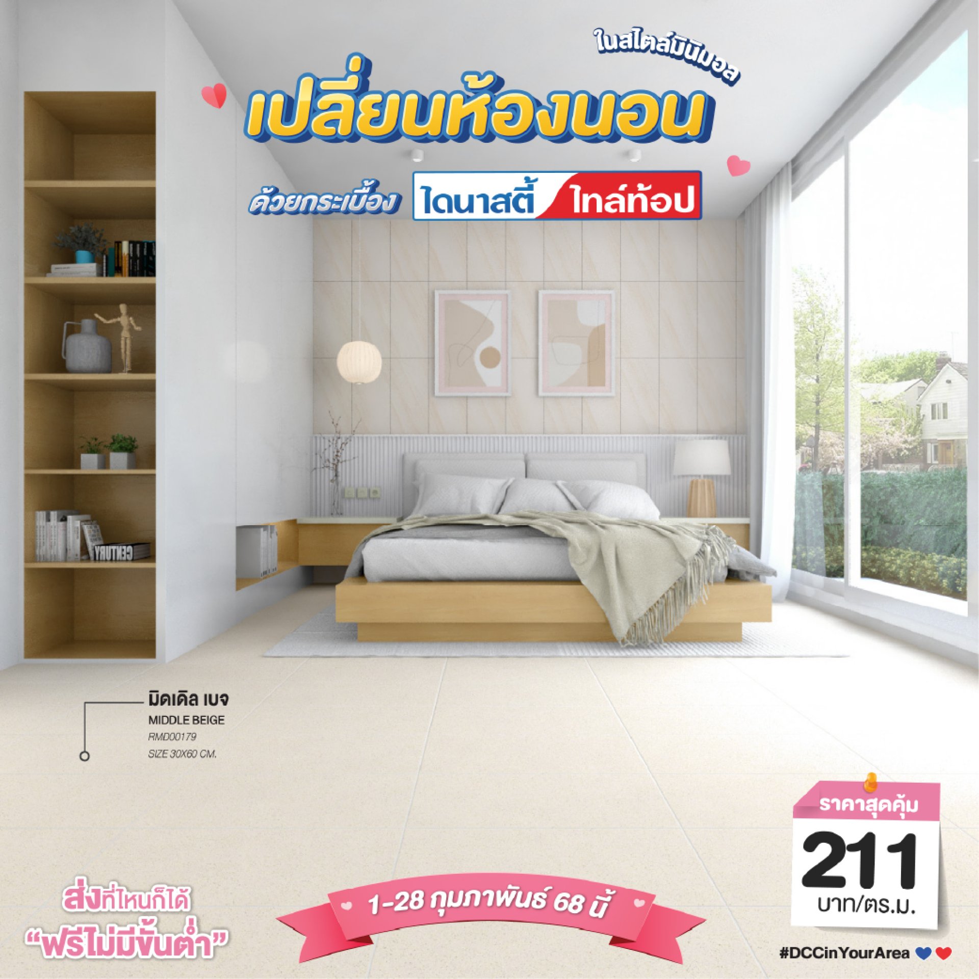 เดือนแห่งความรักนี้ สร้างบรรยากาศห้องนอนของคุณให้เรียบง่าย เต็มไปด้วยเสน่ห์ที่ชวนอบอุ่นด้วยกระเบื้องขนาด 30X60 ซม. ในราคาสุดคุ้มเพียง 211 บาท/ ตร.ม. เท่านั้น ช้อปเลย ที่ไดนาสตี้ ไทล์ท้อป ทุกสาขา ทั่วไทย