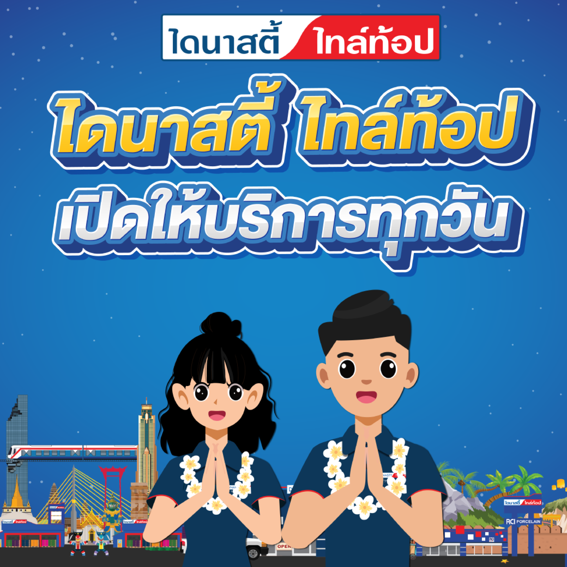 ไดนาสตี้ ไทล์ท้อป เปิดทุกวัน ช้อปสะดวก กว่า 200 สาขาทั่วประเทศ พร้อมให้บริการลูกค้าทุกท่าน จำหน่ายกระเบื้องปูพื้น-บุผนัง และอุปกรณ์ปูกระเบื้อง และตกแต่งครบ จบที่ในเดียว