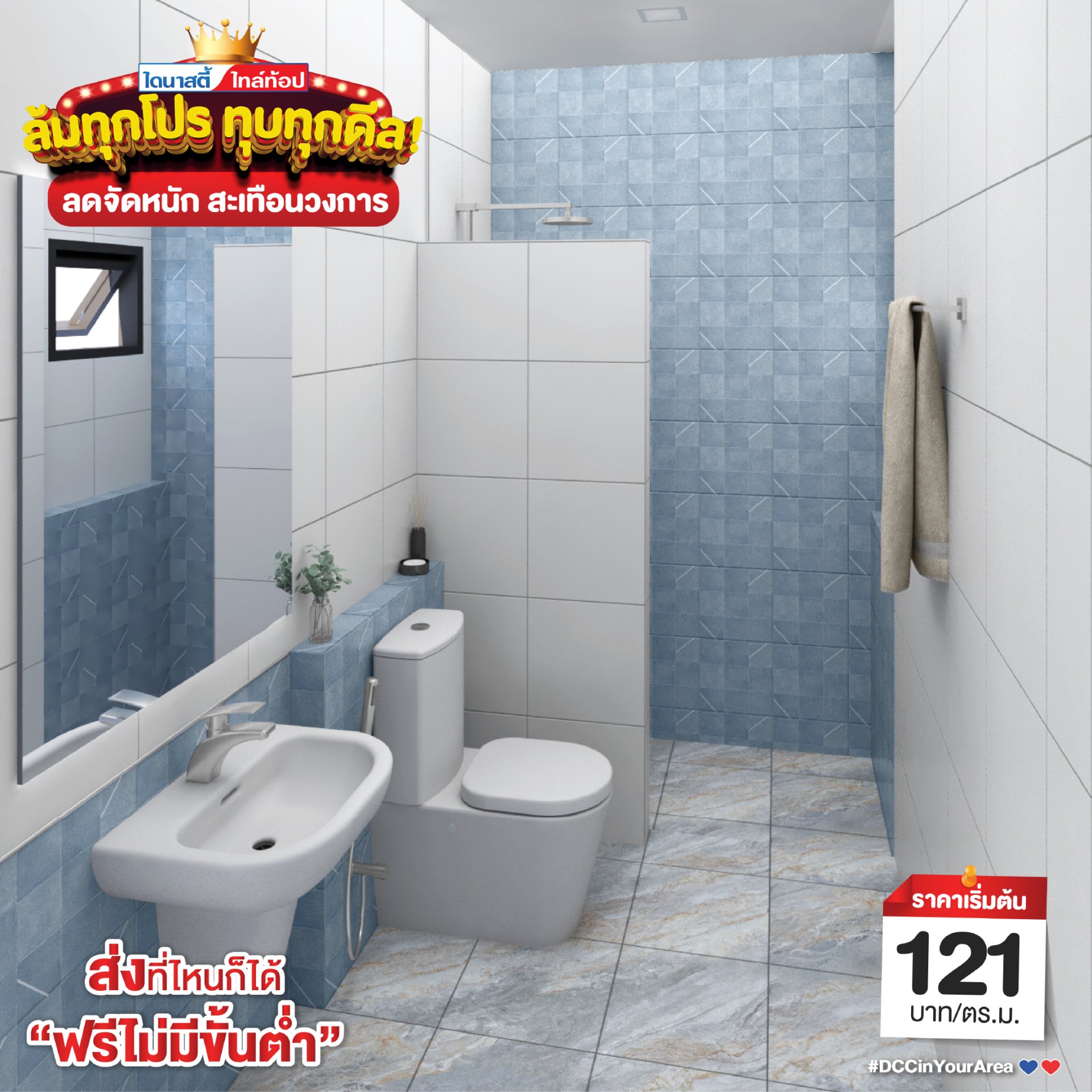 Mix & Match กระเบื้องกันลื่น เข้ากับผนังโทนสีฟ้า และสีขาวให้ความเรียบง่าย แต่ไม่ธรรมดา คุณสมบัติทำความสะอาดง่าย ไม่ทิ้งคราบ และแบคทีเรียสะสม ซื้อช่วงเดือนมีนาคมนี้จะบอกว่า คุ้มมาก !!