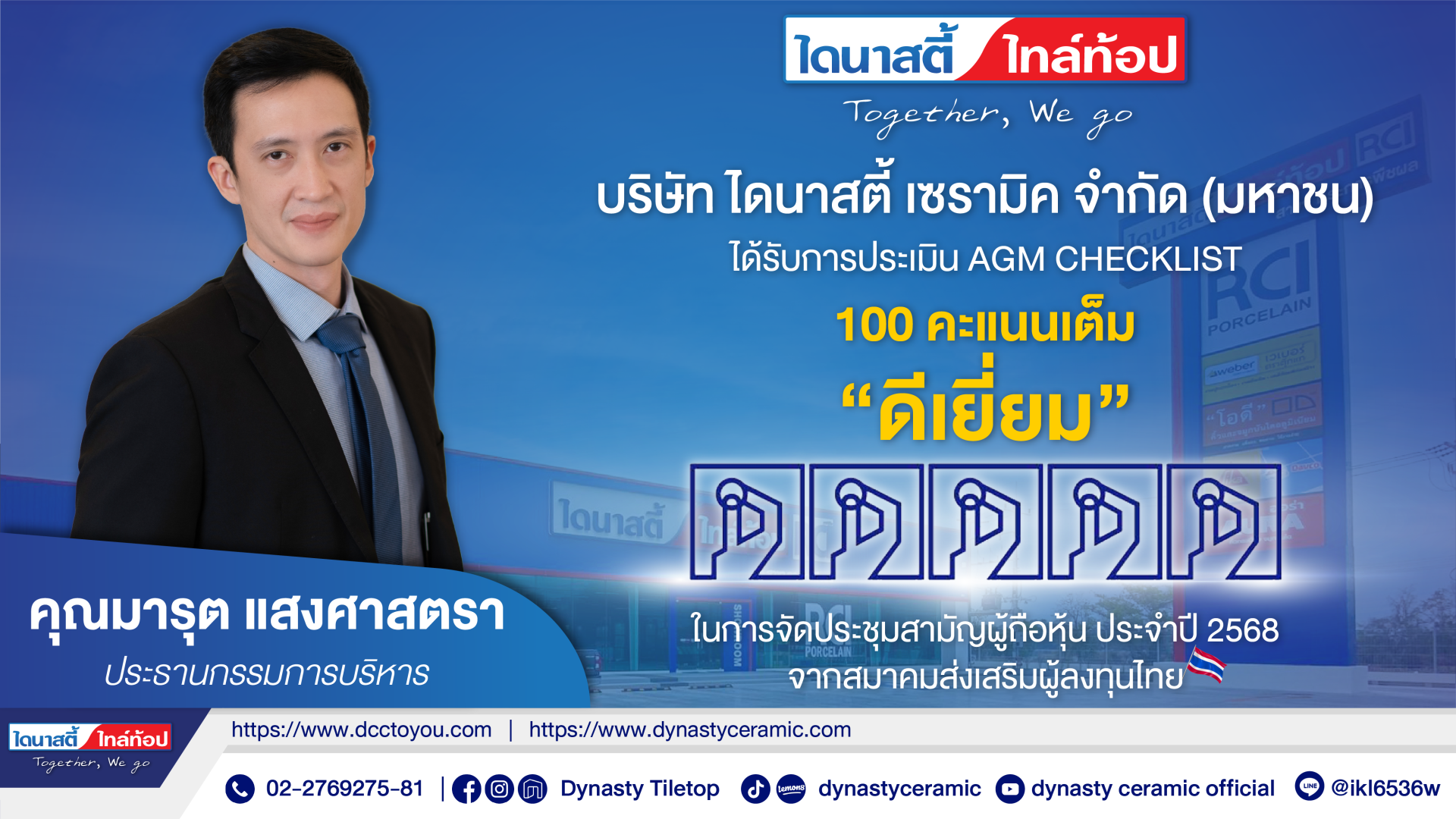 บริษัท ไดนาสตี้ เซรามิค จำกัด (มหาชน) หรือ DCC ได้รับการประเมินเต็ม 100 คะแนน ในระดับ ดีเยี่ยม จากการประเมิน AGM Checklist ประจำปี 2568 โดยสมาคมส่งเสริมผู้ลงทุนไทย