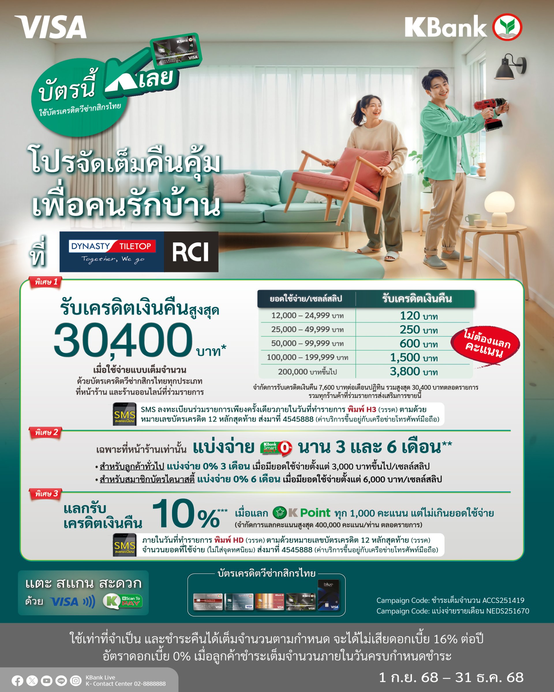 ใช้บัตรเครดิตวีซ่ากสิกรไทยที่ไดนาสตี้ ไทล์ท้อป รับโปรจัดเต็มคืนคุ้มเพื่อคนรักบ้าน พิเศษ 3 ต่อ