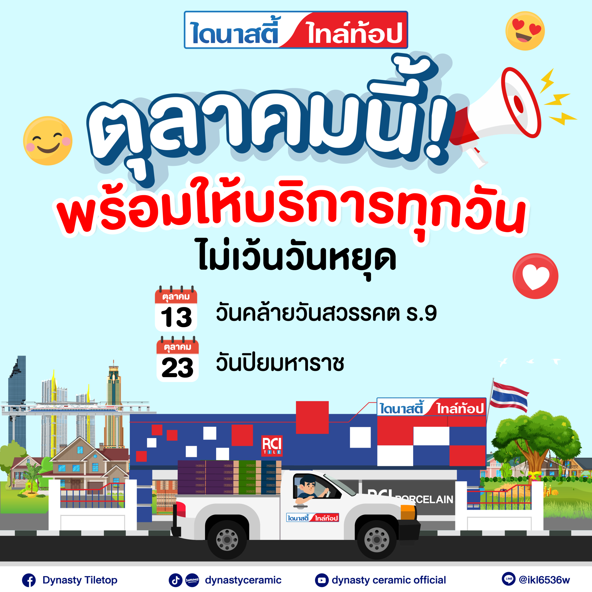 เพื่ออำนวยความสะดวกให้กับลูกค้าทั่วประเทศ ไดนาสตี้ ไทล์ท้อป กว่า 200 สาขาทั่วไทย ยังคงเปิดให้บริการตามปกติทุกวัน ตลอดเดือนตุลาคมนี้รวมถึงในวันหยุดสำคัญทางราชการ ได้แก่