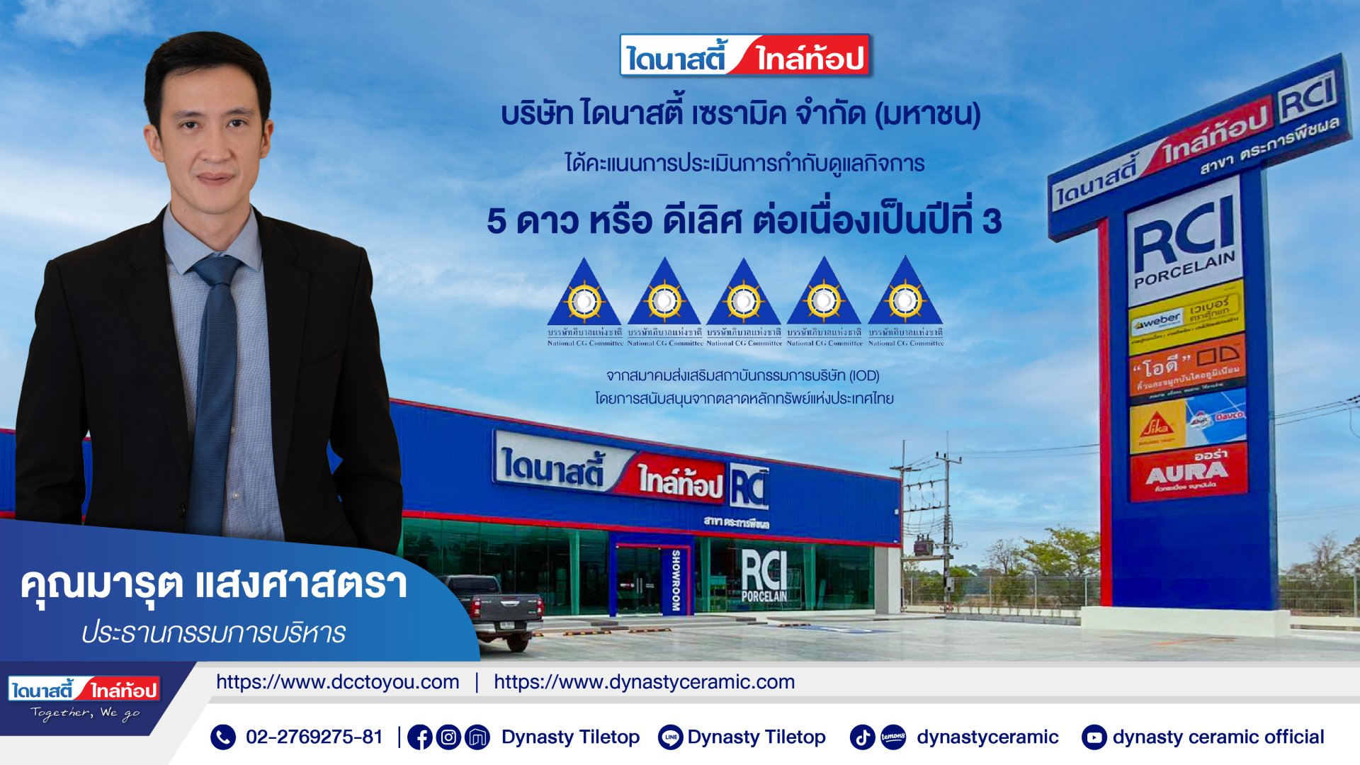 บริษัท ไดนาสตี้ เซรามิค จำกัด (มหาชน) หรือ DCC ผู้ผลิตและจำหน่ายกระเบื้องเซรามิค รวมทั้งพอร์ชเลนที่ผลิตในประเทศไทย โดยคนไทย ได้รับคะแนนการประเมินการกำกับดูแลกิจการในระดับ 5 ดาว หรือ ระดับ ดีเลิศ (Excellent CG Scoring) ต่อเนื่องเป็นปีที่ 3จากผลการสำรวจโครงการสำรวจการกำกับดูแลกิจการบริษัทจดทะเบียนไทย ประจำปี 2568 Corporate Governance Report of Thai Listed Companies 2025 (CGR 2025) จากสมาคมส่งเสริมสถาบันกรรมการบริษัทไทย (Thai IOD) ภายใต้การสนับสนุนจากตลาดหลักทรัพย์แห่งประเทศไทย (ตลท.) และ สำนักงานคณะกรรมการกำกับหลักทรัพย์และตลาดหลักทรัพย์ (ก.ล.ต.)