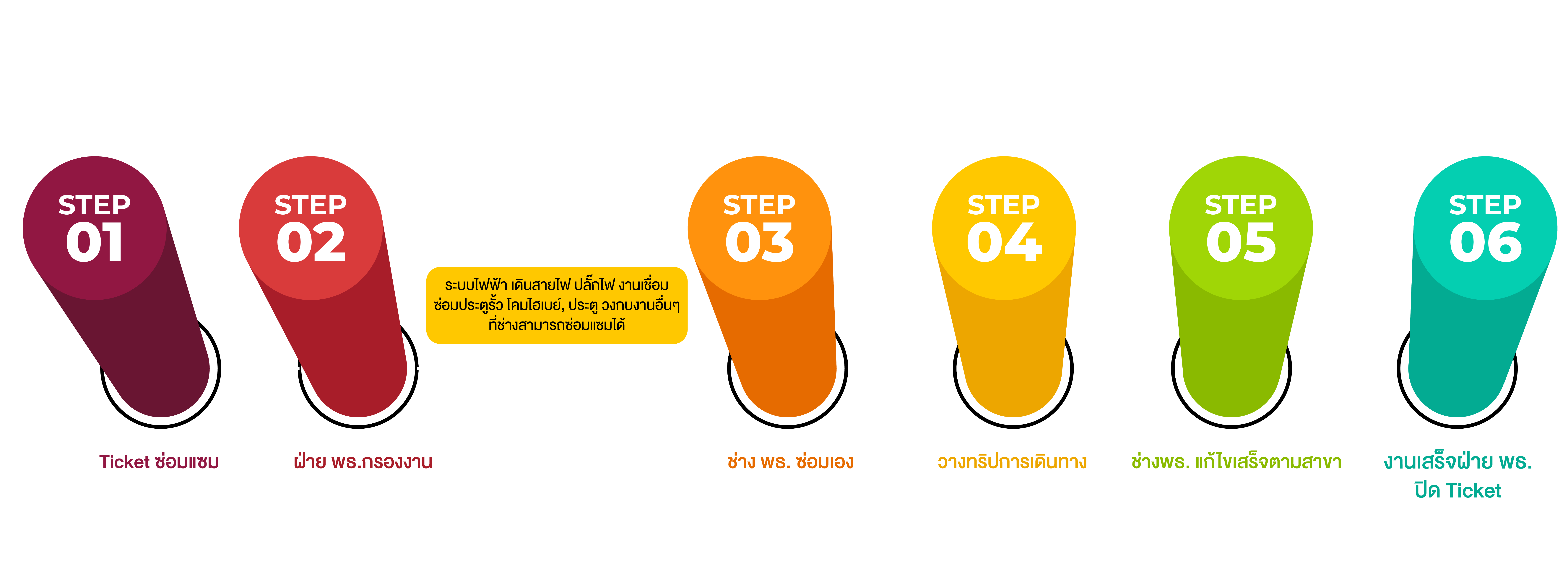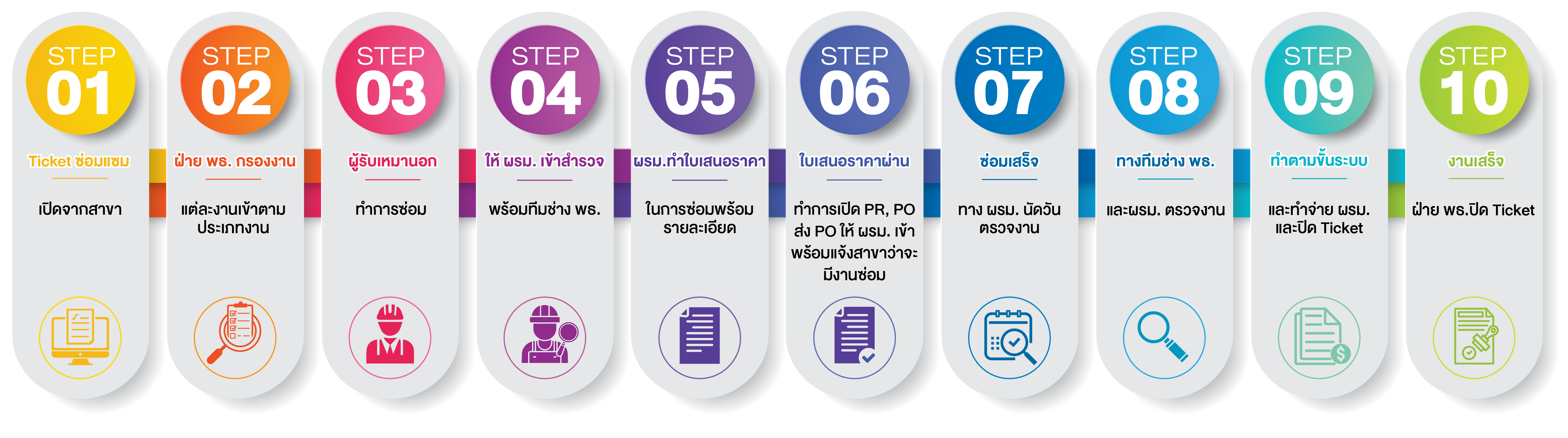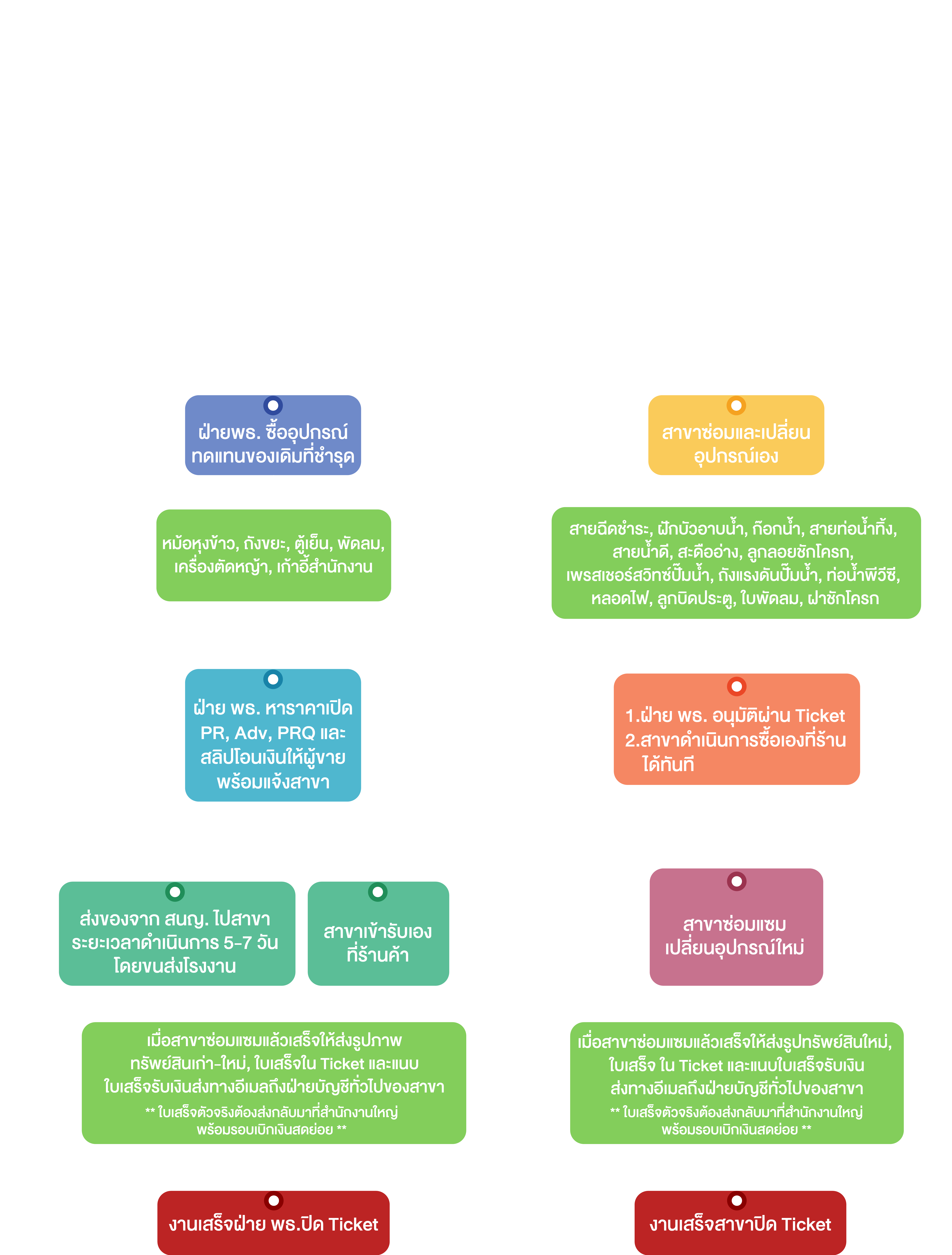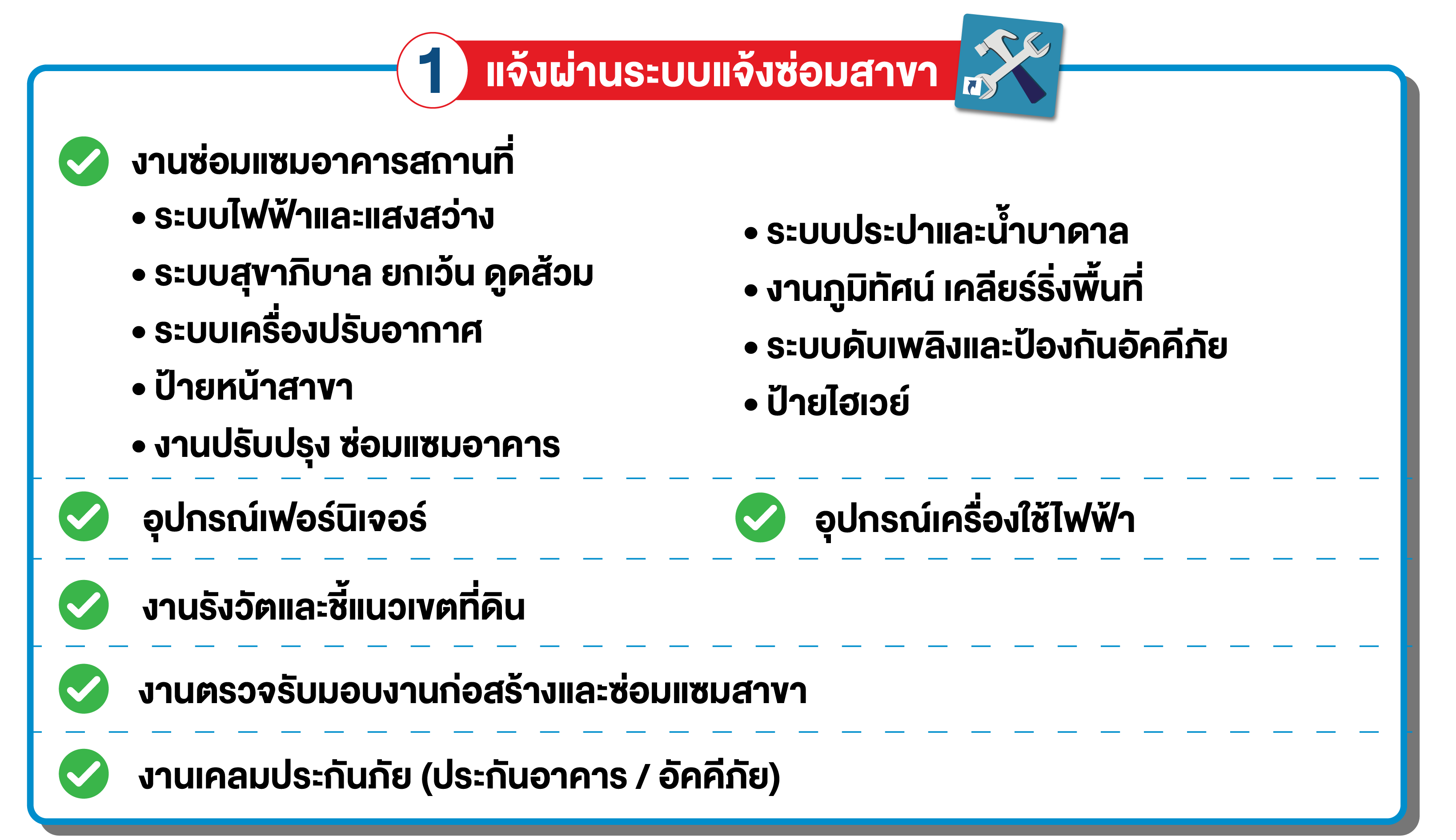 เพื่อให้การทำงานของแต่ละสาขาเป็นไปอย่างราบรื่น มีประสิทธิภาพ และสามารถให้บริการลูกค้าได้อย่างต่อเนื่อง หน้านี้จัดทำขึ้นเพื่อใช้ในการแจ้งซ่อมอุปกรณ์ที่ชำรุดภายในสาขา พร้อมทั้งรวบรวมขั้นตอนการแจ้งซ่อม แนวทางปัญหา การสังเกต อาการผิดปกติรวมถึงแนะนำการซ่อมแซม และวิธีเช็คเมื่อซ่อมแซมแล้วเสร็จ อุปกรณ์พื้นฐานในการซ่อมแซมนั้น พนักงานสามารถตรวจเช็คและซ่อมแซมได้ด้วยตนเอง